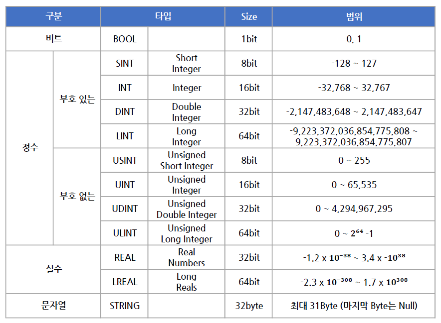 안녕하세요, 텍이 입니다! PLC 강의 #4 오늘은 PLC의 메모리 수치체계에 대해서 강의하는 내용을 담아보았습니다. 메모리는 LS산전 XGT 시리즈 기준으로 설명드리겠습니다. * XGT 시리즈 기준으로 설명하겠습니다. (XGI, XGK 공통) 전에 설명드린 내용은 PLC 데이터의 단위이구요 이번에 설명드리는건 수치를 표현하는 PLC 데이터의 타입에 관한 내용입니다. 데이터의 단위에 대한 내용은 아래 글을 참고해주세요. ↓ ↓ ↓ ↓ PLC의 메모리 수치체계 (데이터의 단위와 표현법) PLC의 메모리 수치체계 (데이터의 단위와 표현법) 안녕하세요, 텍이 입니다! PLC 강의 #3 오늘은 PLC의 메모리 수치체계에 대해서 강의하는 내용을 담아보았습니다. 모든 PLC는 비트(Bit)를 가지고 데이터를 표현하..