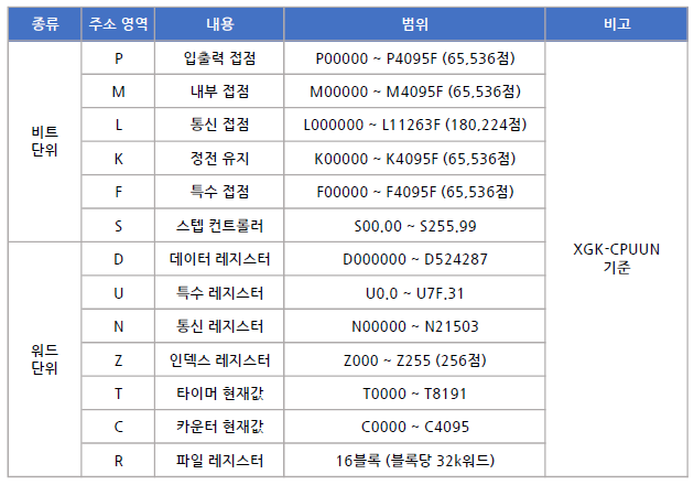 안녕하세요, 텍이 입니다! PLC 강의 #1 오늘은 PLC의 메모리에 대해서 강의하는 내용을 담아보았습니다. 메모리는 LS산전 XGK(MASTER-K) 시리즈 기준으로 설명드리겠습니다. * XGK CPUUN이라는 모델을 기준으로 범위를 설명했습니다. 먼저 기본적으로 XGK에서는 메모리가 비트를 베이스로 한 메모리냐? 워드를 베이스로 한 메모리냐에 따라 표현법이 달라지는데 비트 메모리 같은 경우에는 마지막에 해당하는 값이 비트를 의미합니다. 워드 메모리 같은 경우에는 워드로만 이루어져 있습니다. 그럼 일단 각각의 메모리가 어떤 특징을 가지고 있는지 한 번 보겠습니다. 간단하게 내용이 나와 있죠. 앞서 말한대로 비트단위와 워드 단위가 있습니다. 먼저 P영역은 기본적으로 I/O (InPut / OutPut) ..